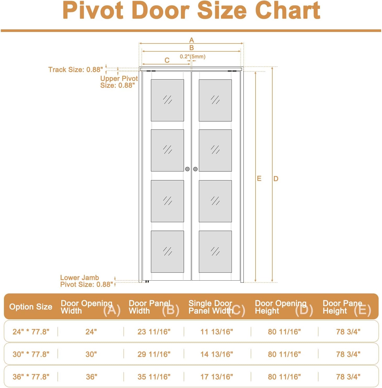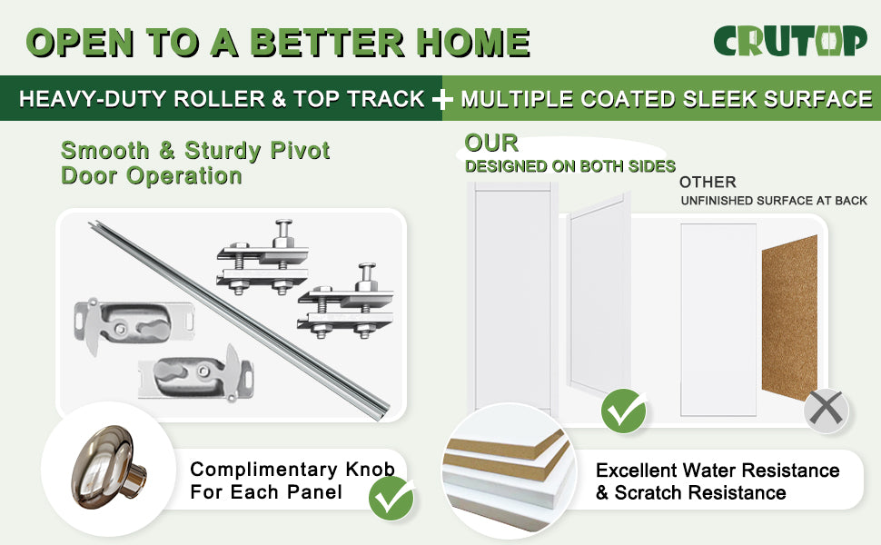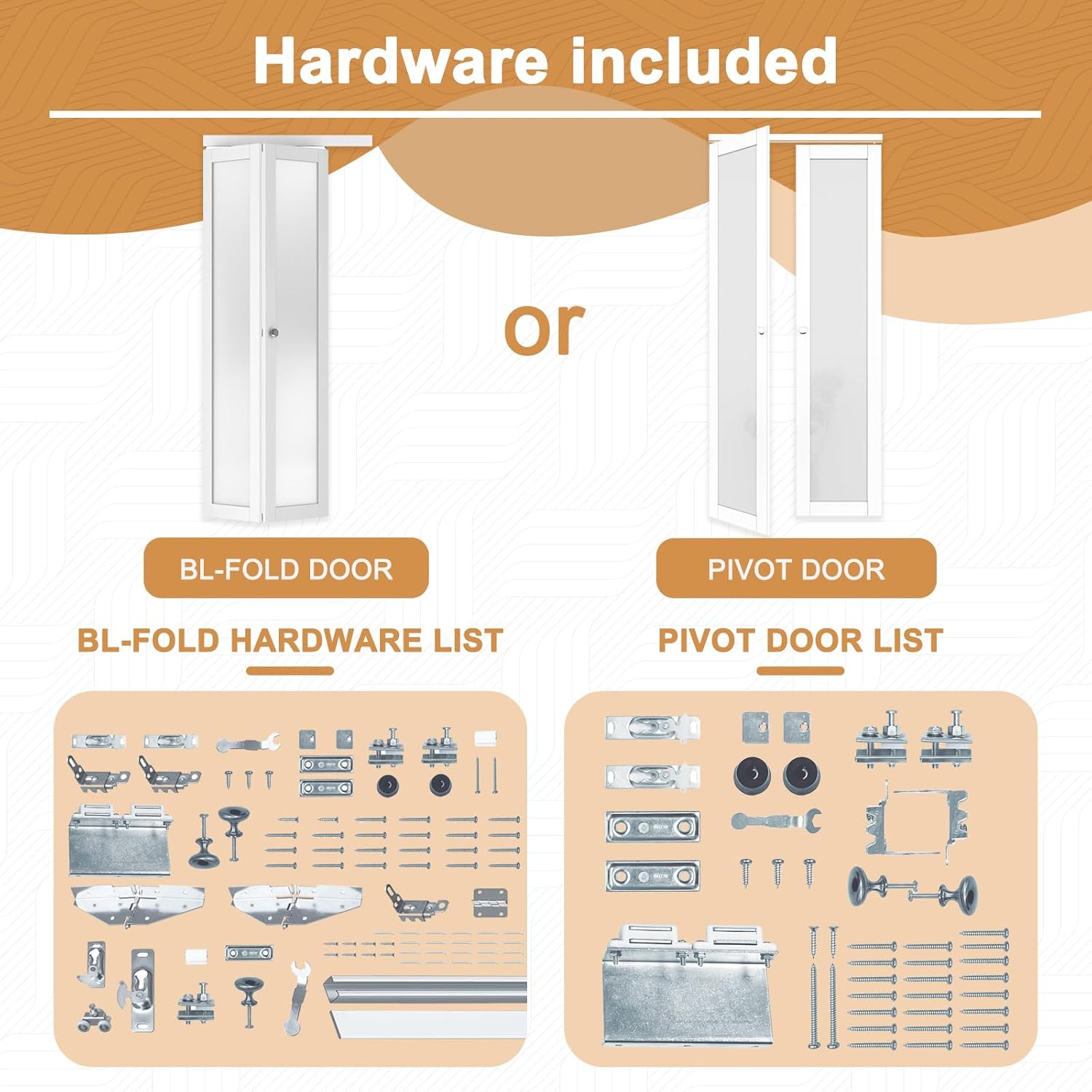 🔩 【Complete Pivot Hardware】 The package includes door panels, all necessary hardware kits for installation, and a detailed instruction manual. No additional parts need to be purchased—just follow the instructions to install. Additionally, a fascia is included to conceal the door hardware from view. (If the installation manual is missing, please let us know and we will send you an electronic copy.)